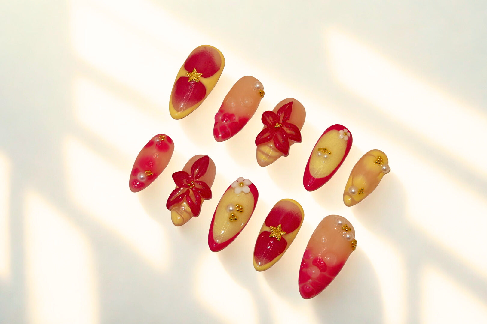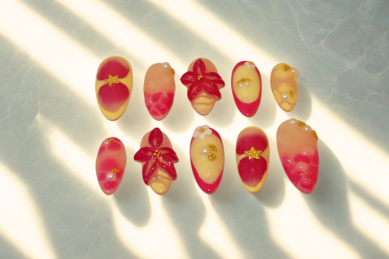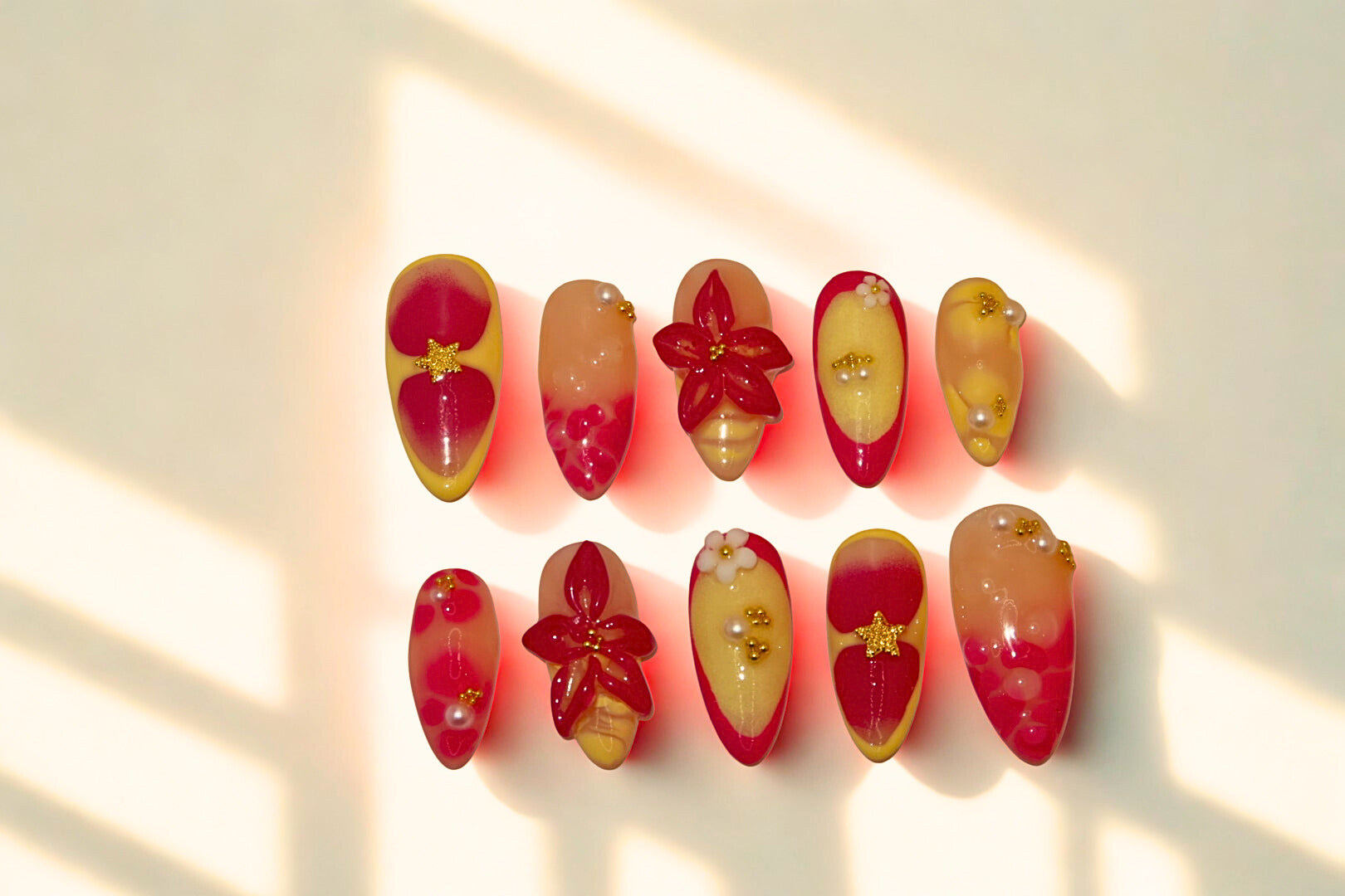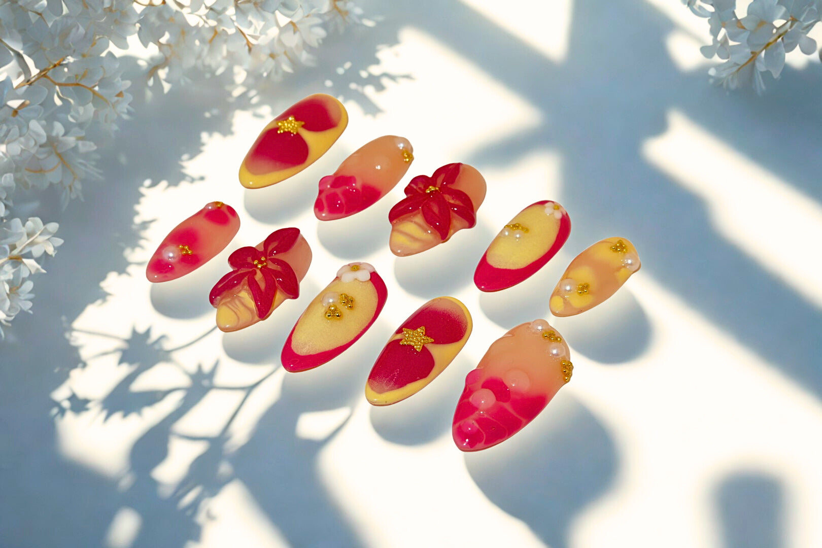 These nails showcase a stunning blend of artistry and elegance. Each nail is adorned with intricate floral patterns that celebrate nature's beauty, featuring vibrant colors that pop against a soft background. Delicate pearl accents add a touch of luxury, while golden stars sprinkle a hint of celestial charm. The overall effect is whimsical yet sophisticated, perfect for making a statement on any occasion. This design epitomises the fusion of playful creativity and refined style, ensuring that each set will be a captivating centrepiece.