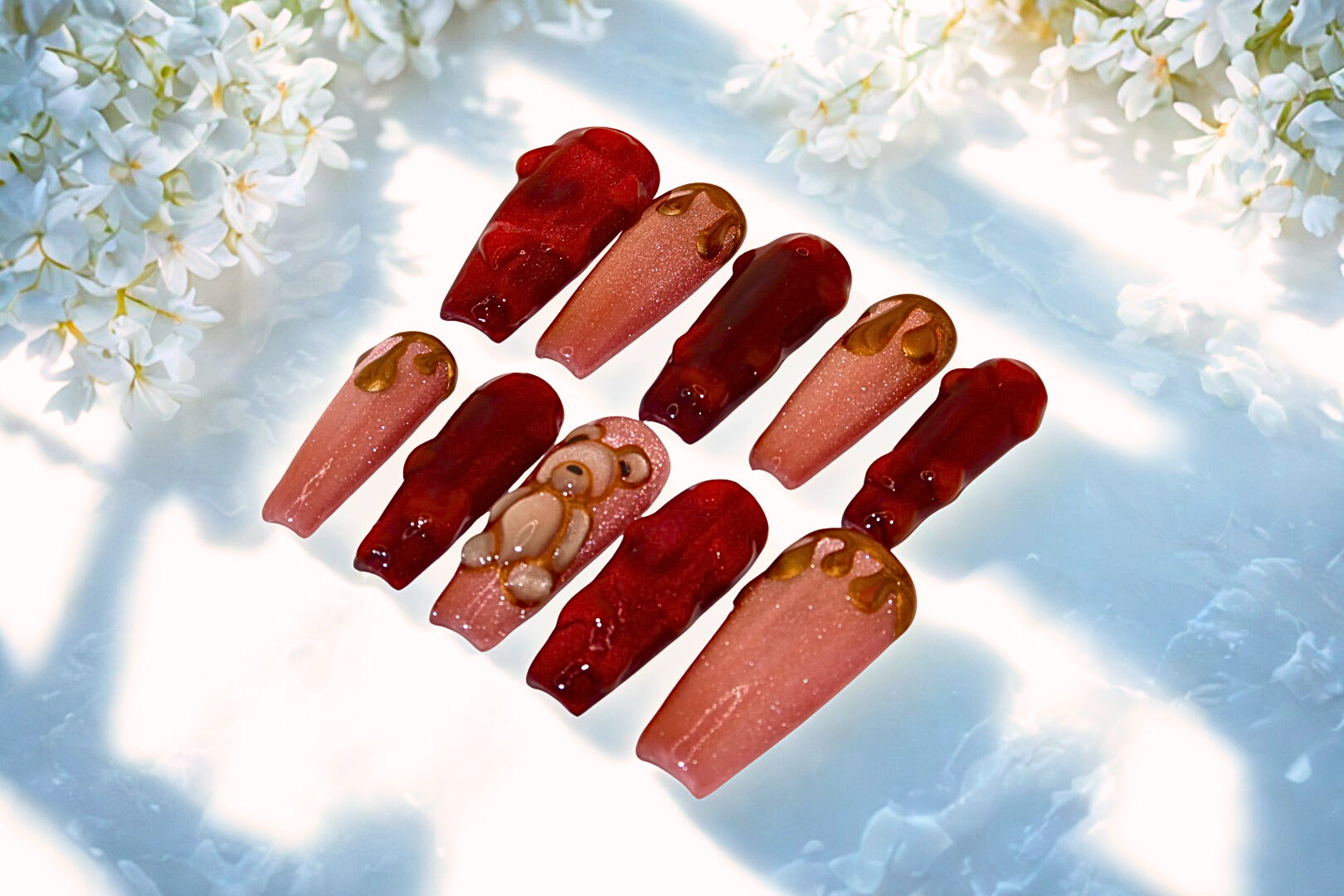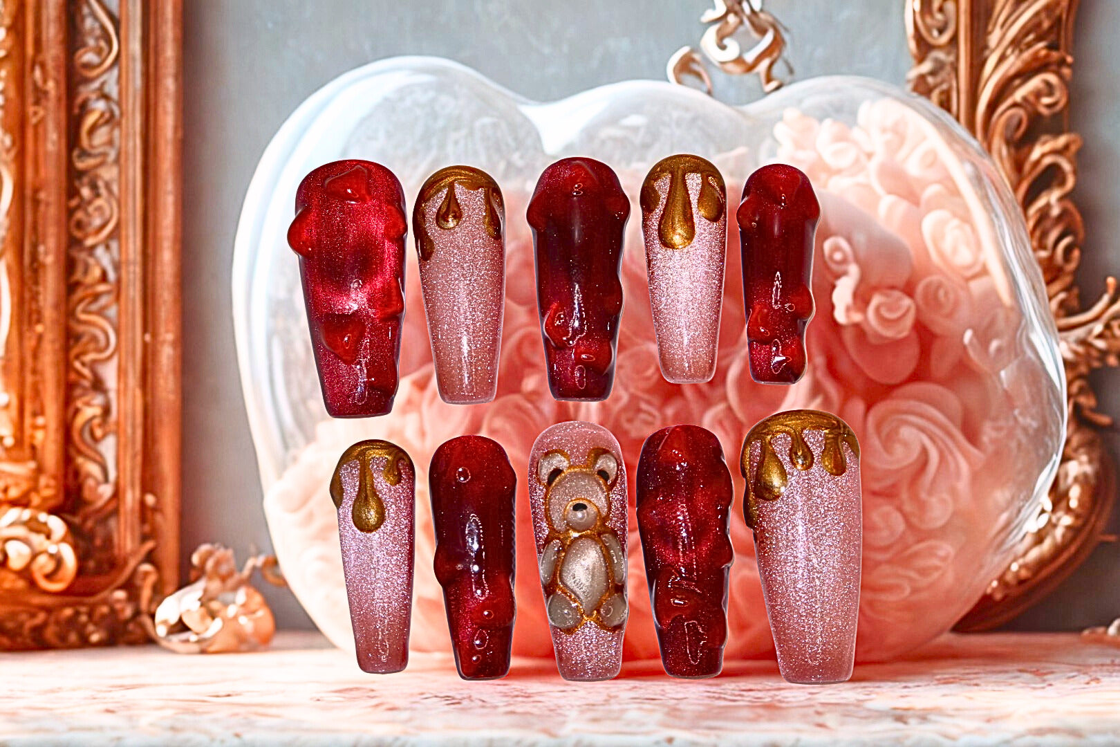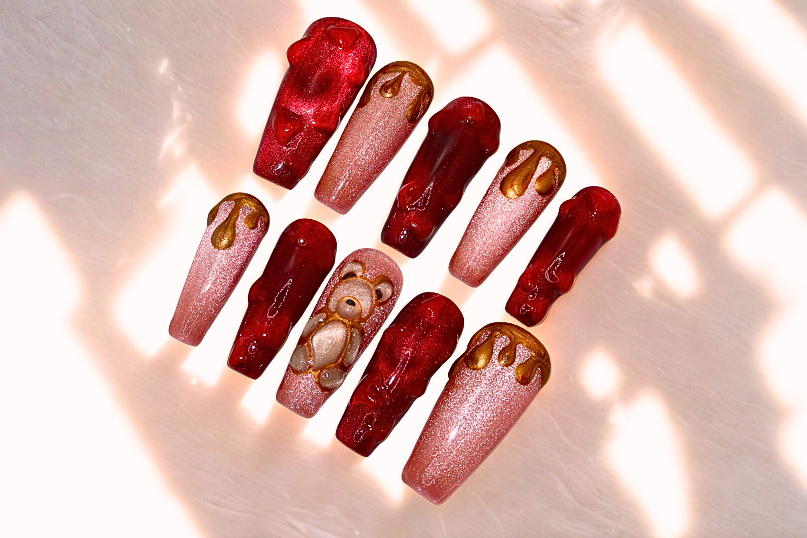 Red hearts, pink glitter and a gold bear!!! This set is created using cateye polish. From the gold dripping from the top to the subtle magnetic hearts in the middle, this set is perfect for those who love cute and unique nails!