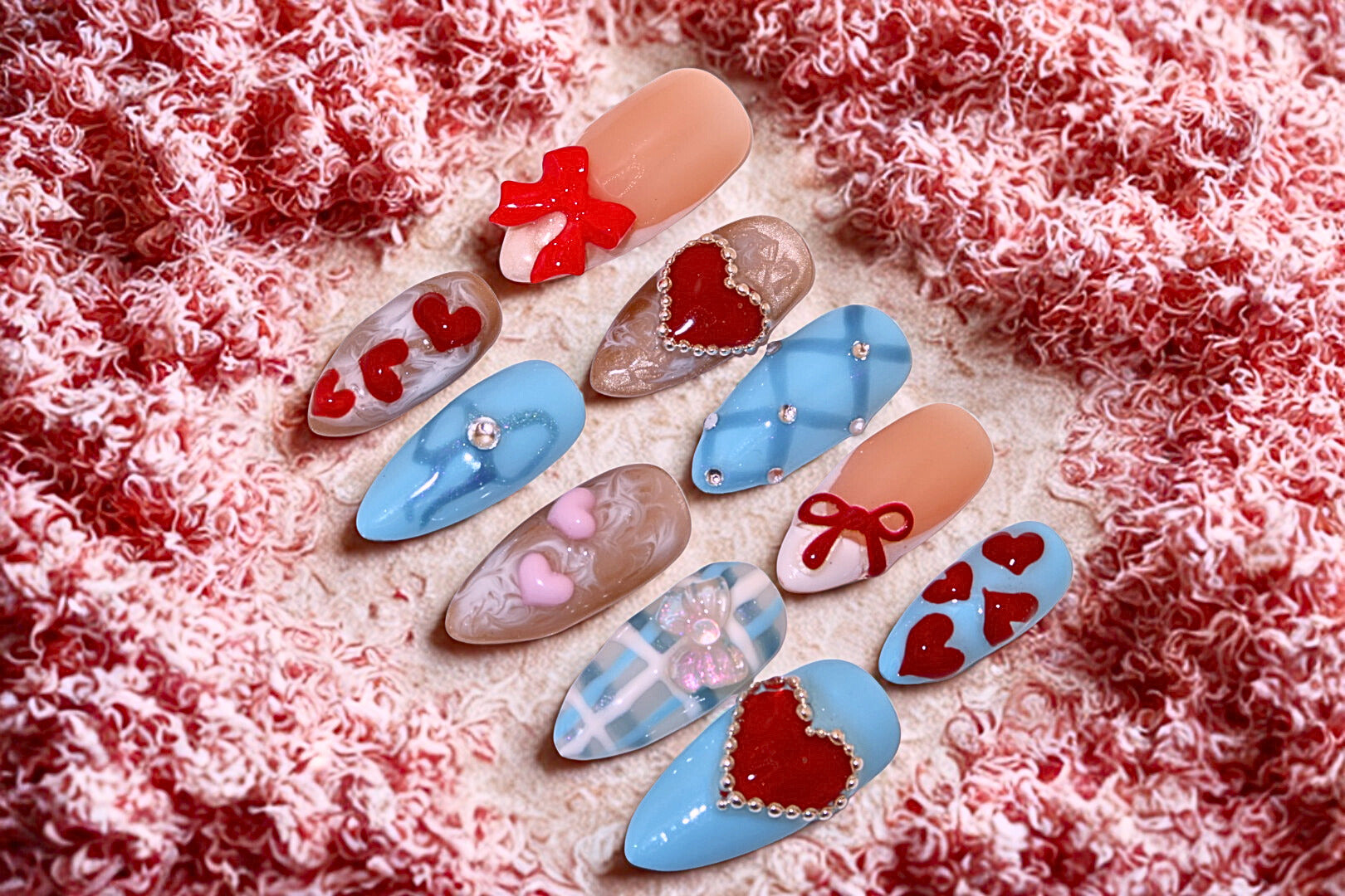Nude with Red Bow: A chic and sophisticated nail with a glossy red bow design. Features red heart designs that add a whimsical touch. 3D Pink Hearts: Bold and playful with two prominent pink heart adornments. Plaid Blue with Bow: A stylish nail with a plaid pattern complemented by a decorative bow. Quilted Blue: Small embellishments create a quilted effect for a textured aesthetic. Nude and White with Ribbon: Features a vibrant red ribbon offering a festive flair.