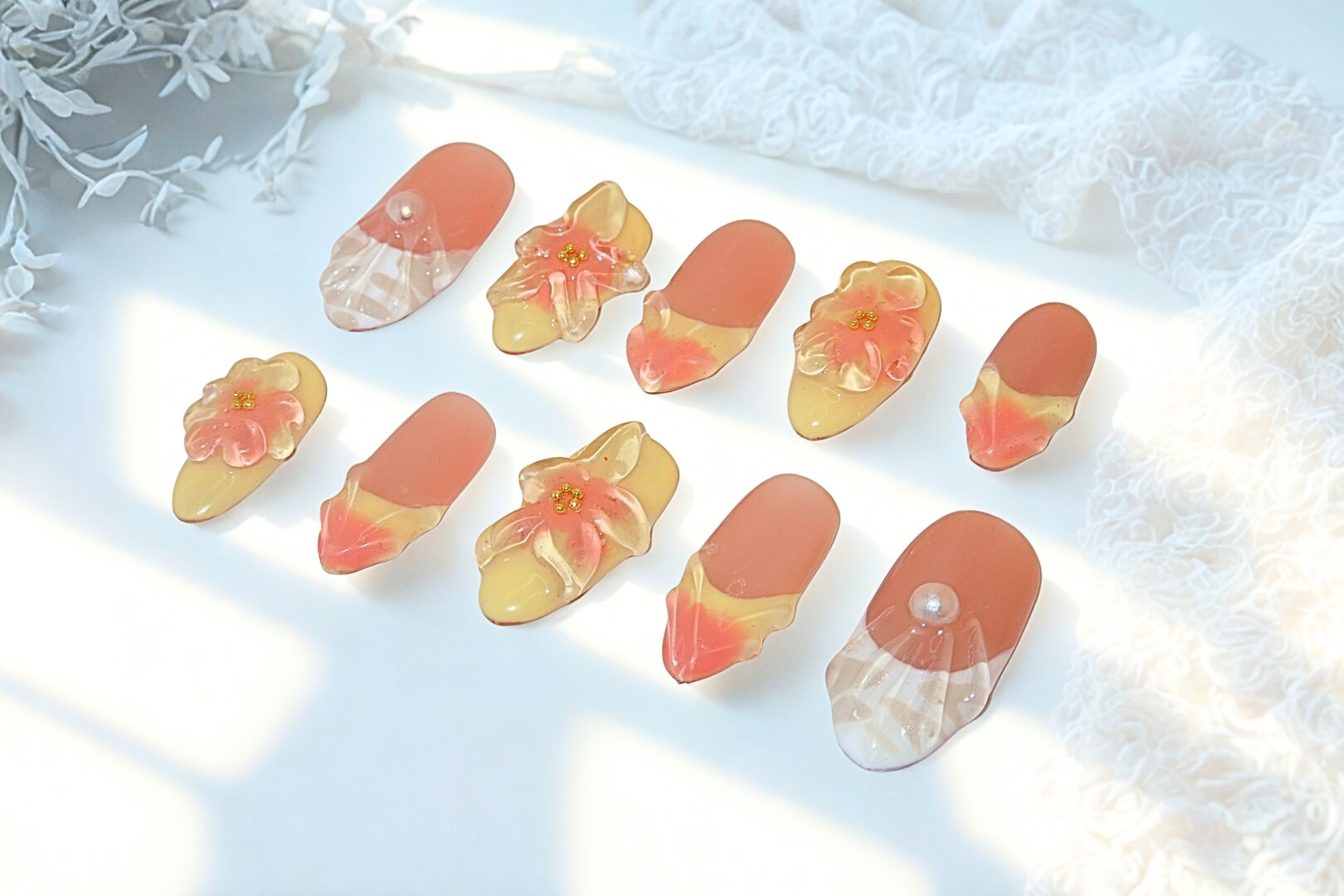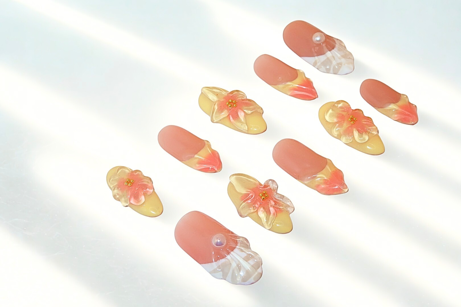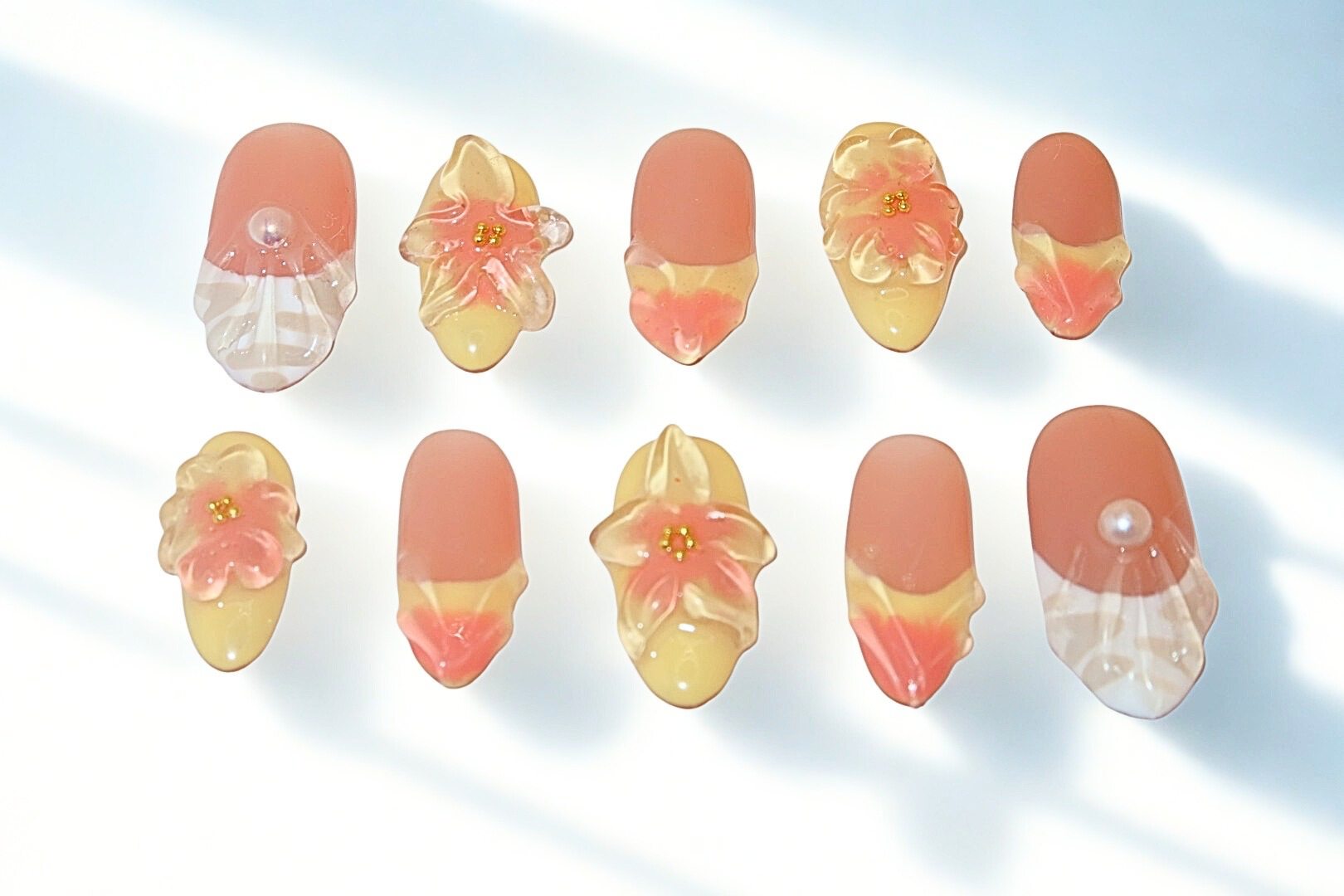 These beautiful nails feature a soft gradient from peach to pastel yellow, adorned with delicate 3D floral designs in translucent pink and gold beads. Accented with pearl details and a striped pattern at the tips, they exude elegance and charm, perfect for a summer look.