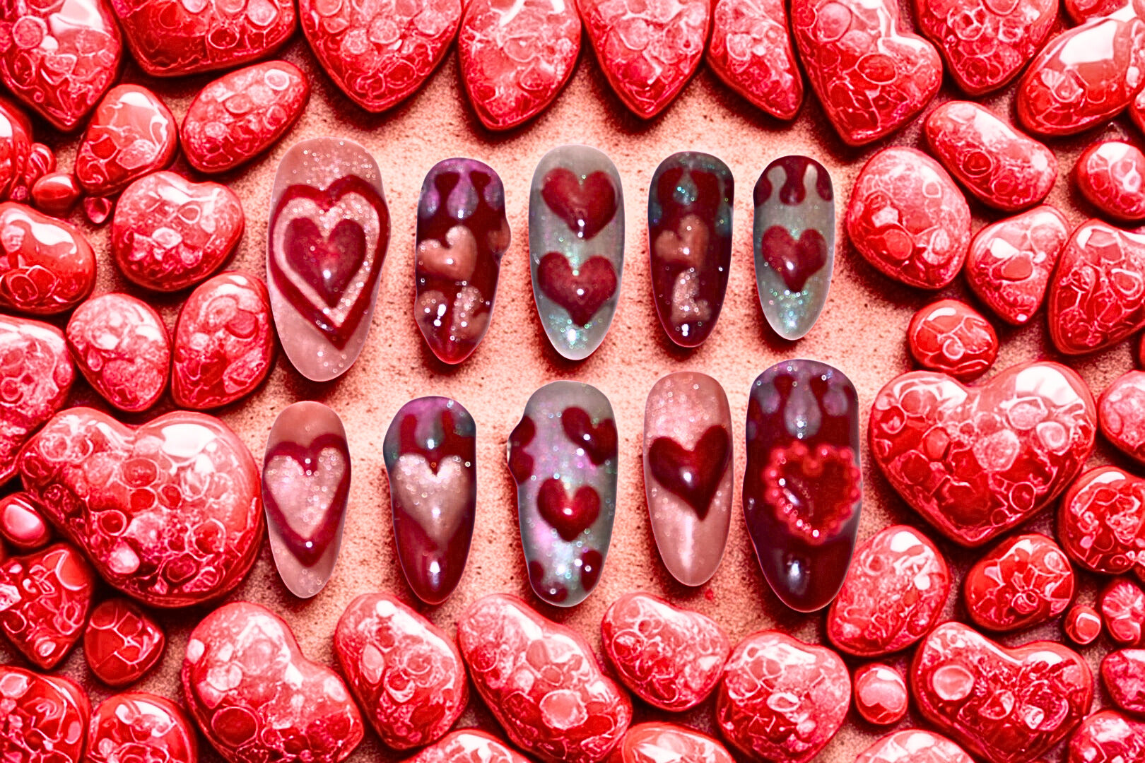 This set of artificial nails exudes romantic charm with an elegant heart-themed design. The nails are adorned in vibrant shades of red and pink, complemented by sparkling glitter for added glamour. Each nail creatively showcases varying heart patterns, ranging from large, bold designs to a delicate array of smaller hearts. One standout nail features 3D embellishments with small beads or pearls encircling a heart, enhancing the luxurious feel. Overall, these glossy nails make a perfect choice for a romantic or festive occasion, capturing the essence of love and celebration.