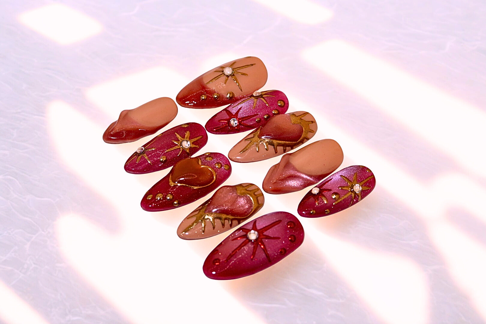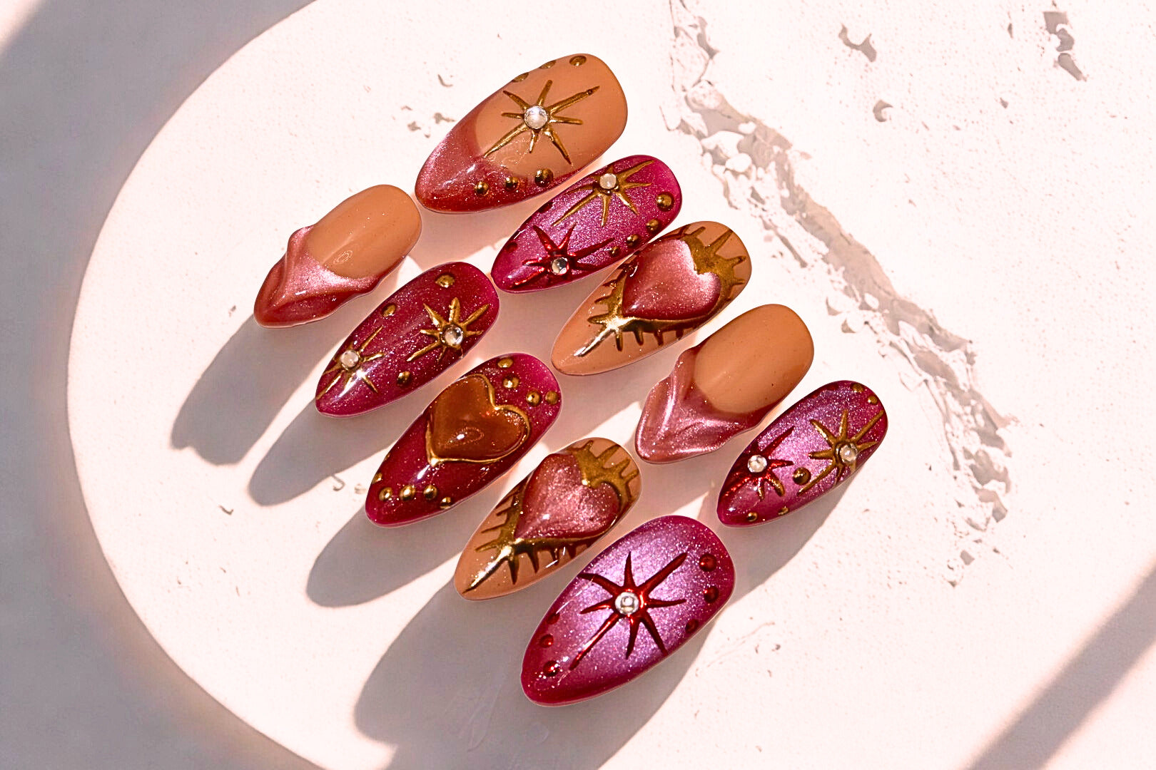 The nails have metallic gold star or sunburst designs centered with pearls or gems, and some feature raised heart shapes in gold. Small gold bead embellishments add detail, arranged in two overlapping rows. The overall style is delicate, mixing celestial and romantic motifs.