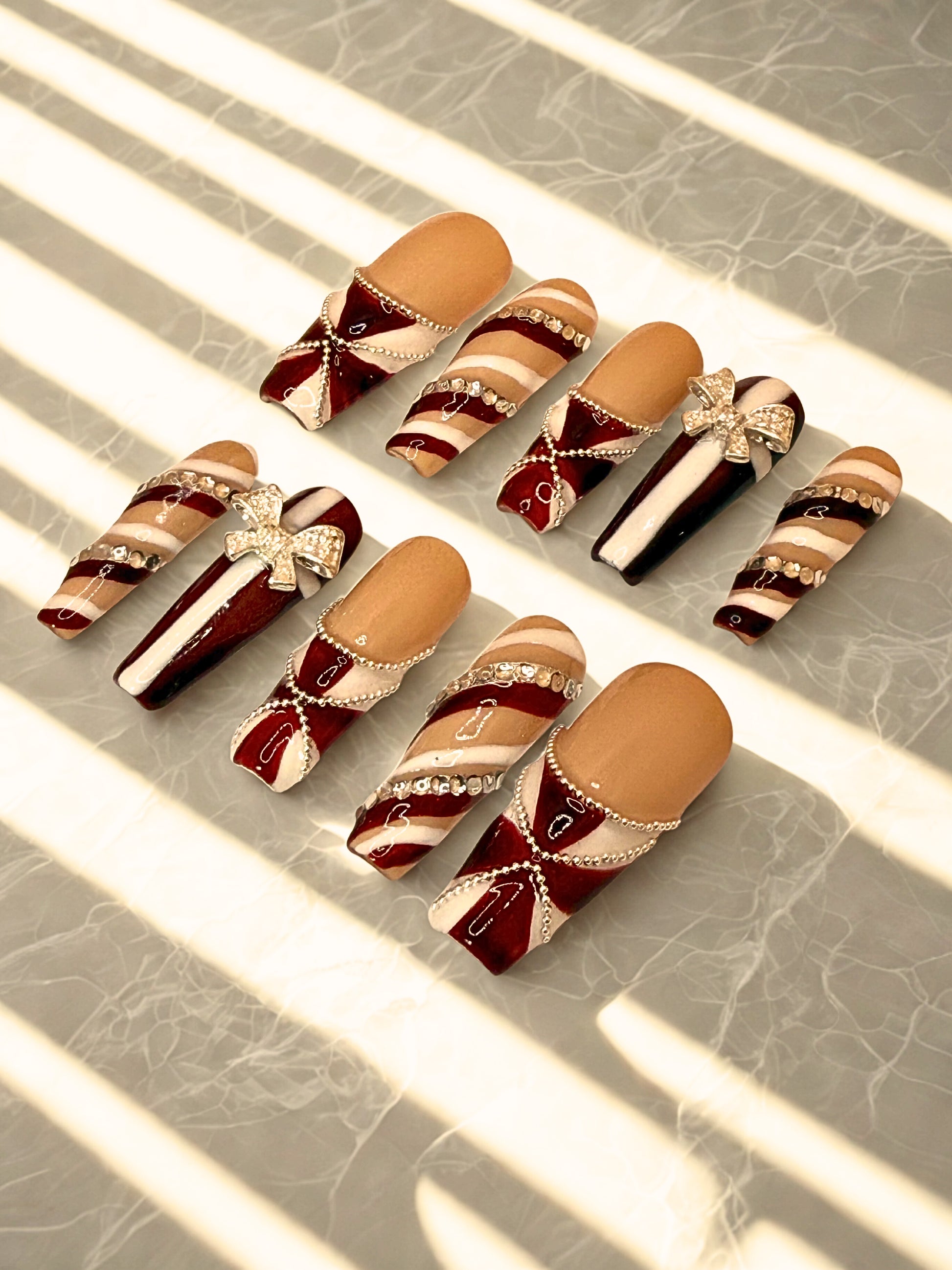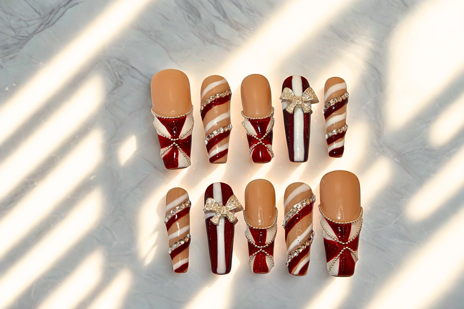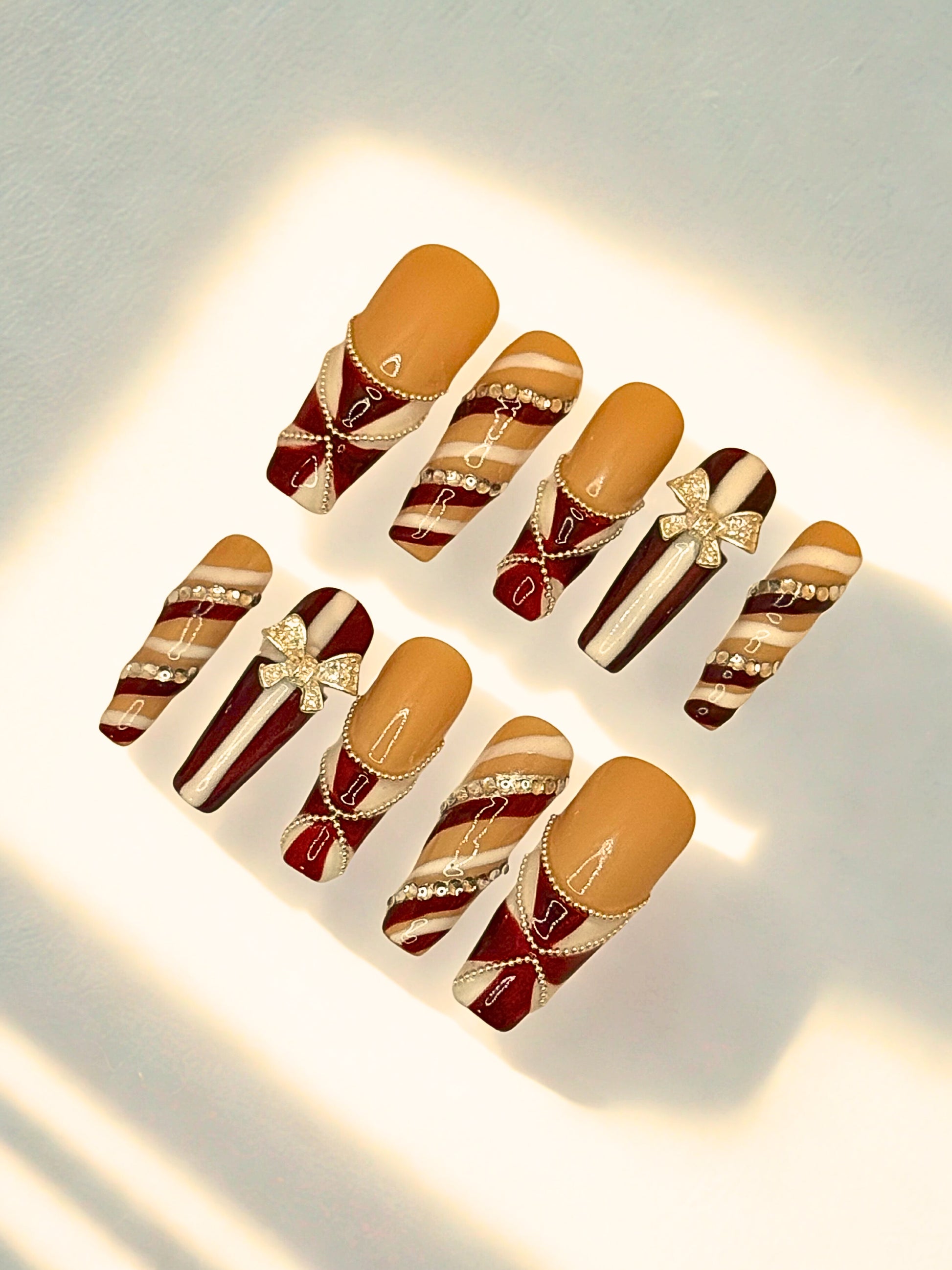 Elevate your nail game with the Crimson Swirl set, an exquisite assortment of press on nails that embody elegance and sophistication. Each nail features a stunning blend of vibrant colors, adorned with intricate designs and charming bow accents, perfect for making a bold statement. The collection combines glossy finishes with unique textures, ensuring that your nails not only look fabulous but also feel luxurious. Whether you're dressing up for a special occasion, holiday or simply looking to add a touch of glamour to your everyday style, these nails are designed to impress. Easy to apply and comfortable to wear, the Crimson swirl set is the ultimate choice for those who appreciate high-quality nail art that stands out!