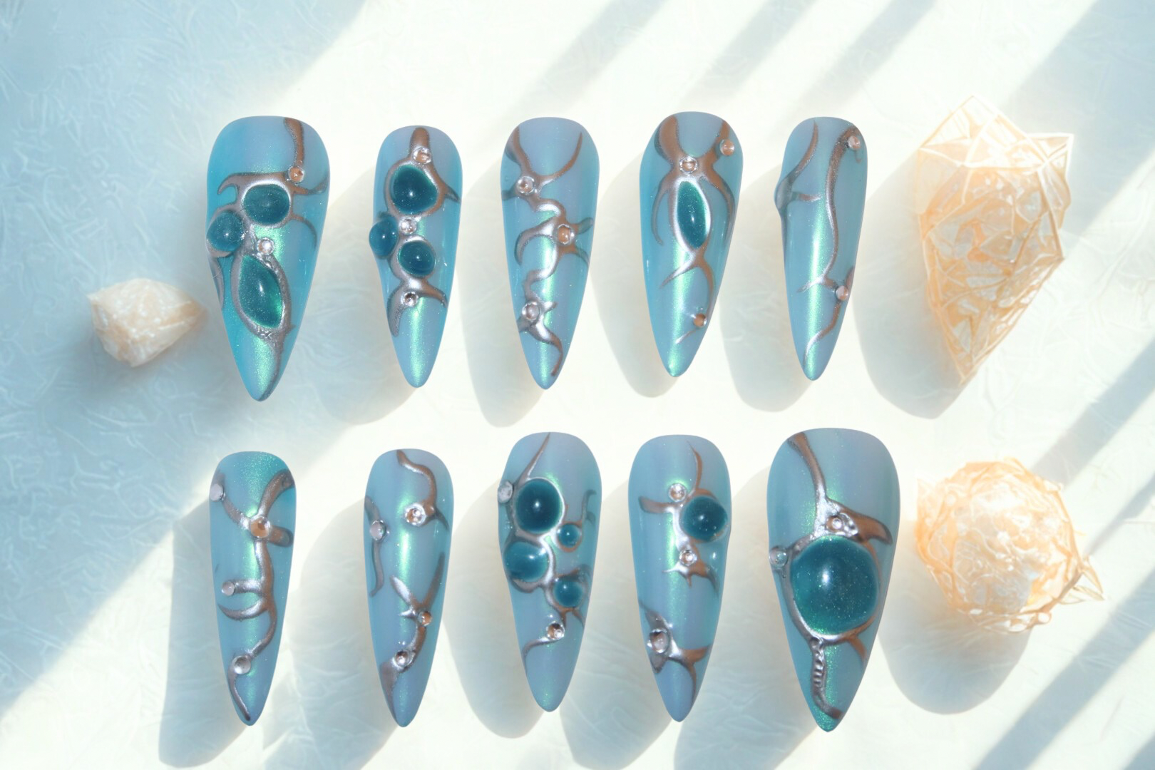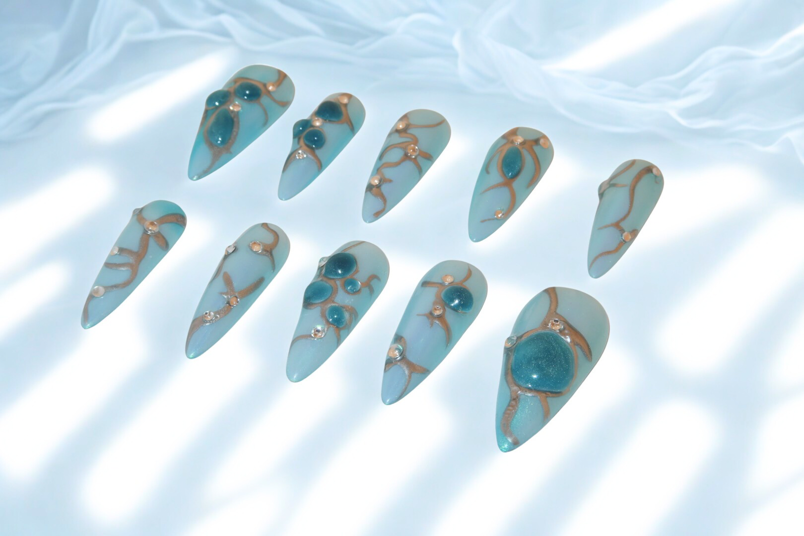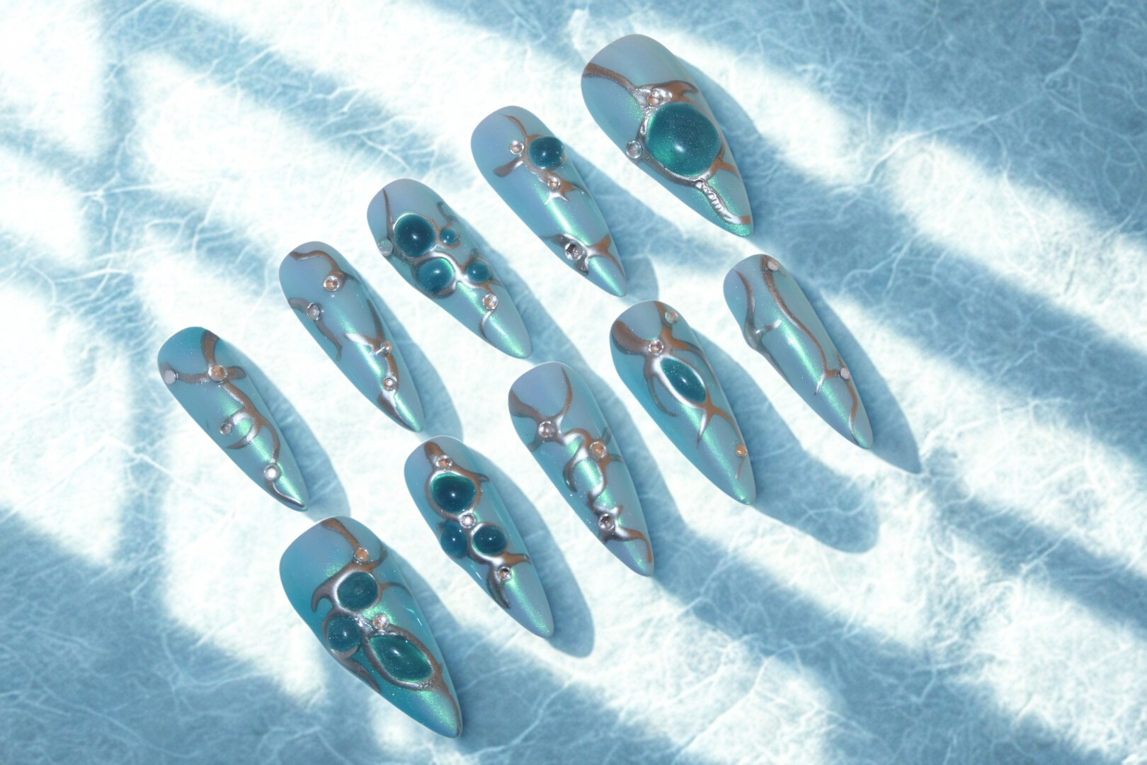 These stunning nails feature a captivating gradient of deep blue, creating a mesmerising blue-inspired design. Enhanced with shimmering accents, the glossy finish adds depth and a touch of elegance. The nails radiate a vibrant energy, making them perfect for a refreshing and chic statement, ideal for summer or any special occasion.