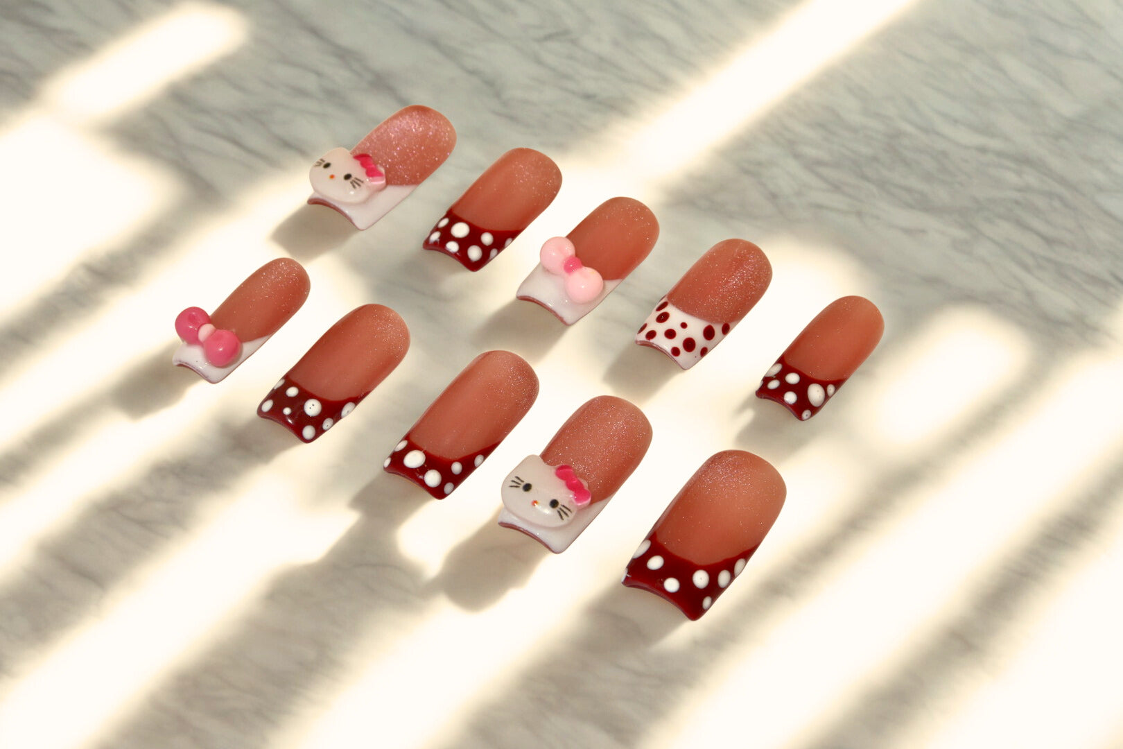 Hello Kitty inspired polkadot French tips with a peachy cat eye gel polish base. We love a bit of Sanrio action ❤️