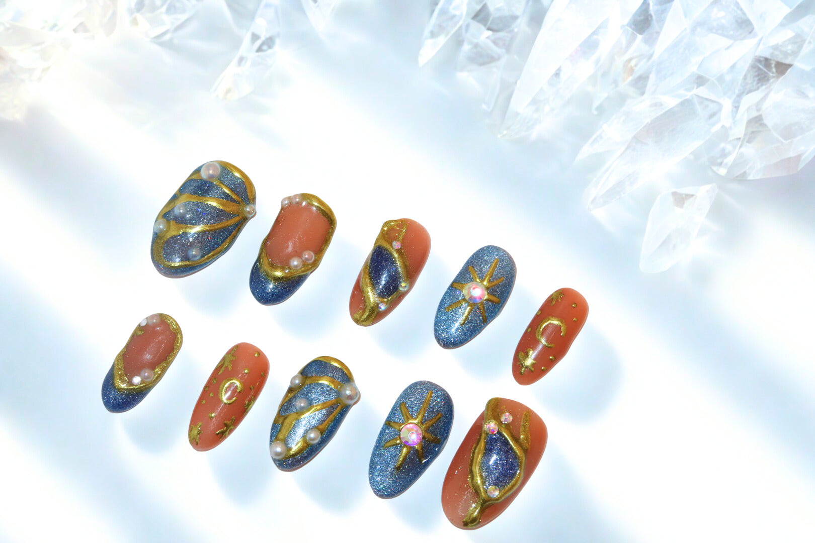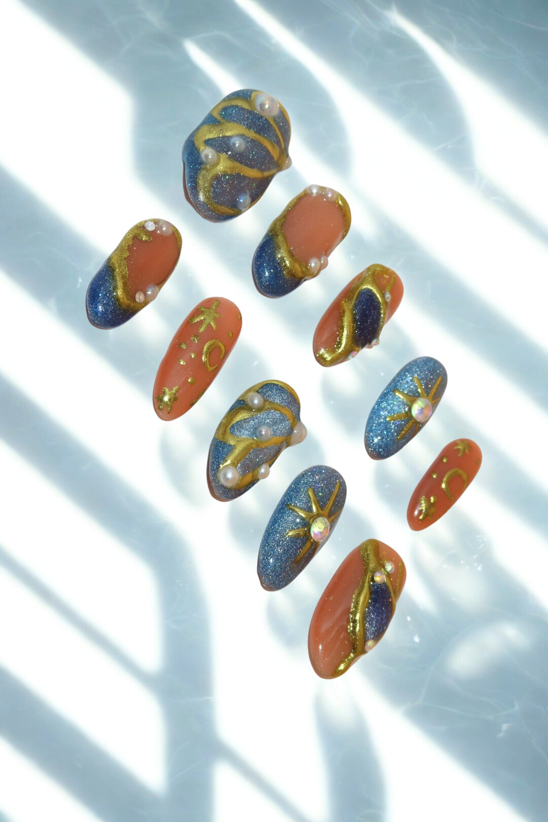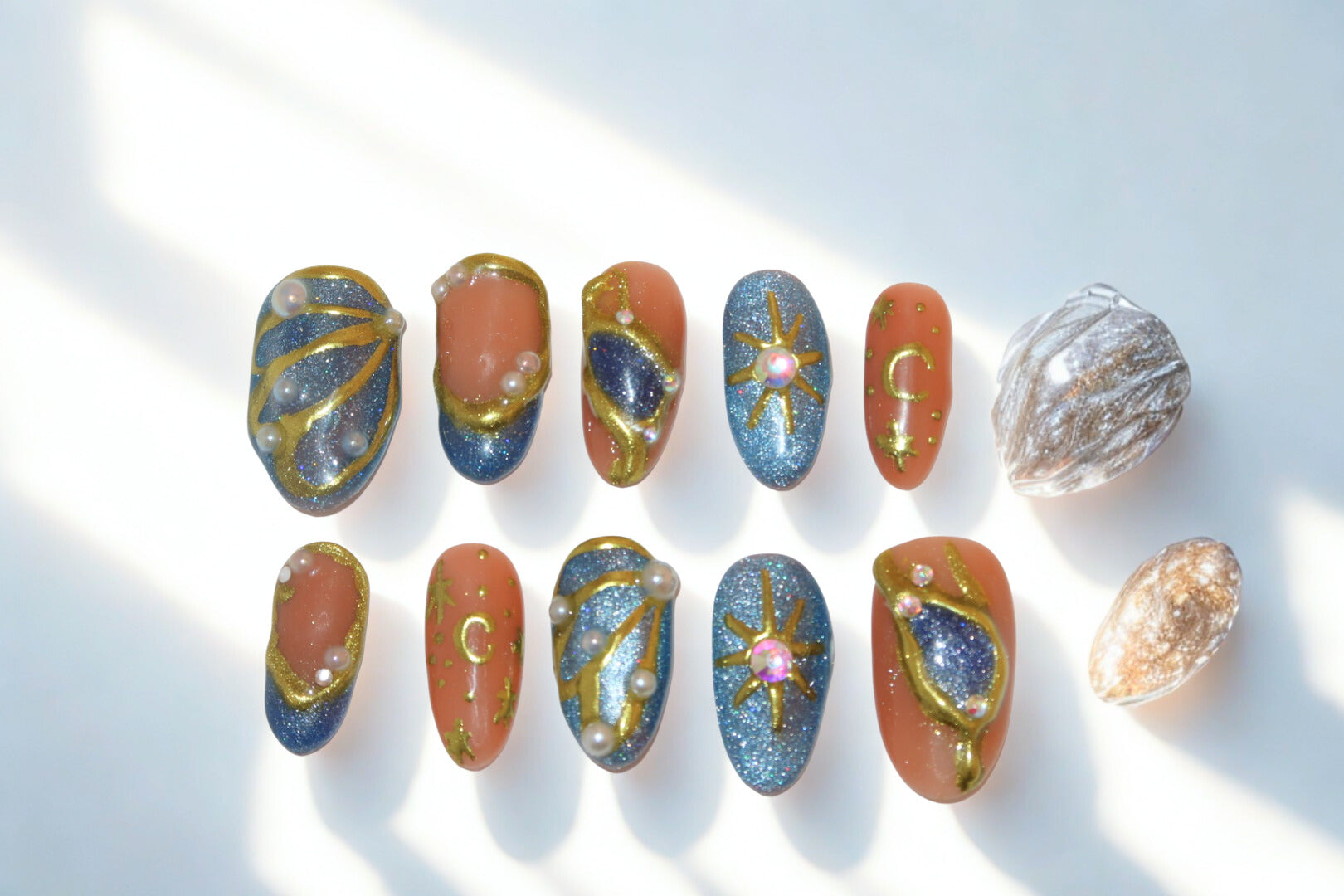 Embrace the cosmos with these celestial nails, featuring shimmering blues and peaches, adorned with stars, moons, and pearls for a truly out-of-this-world look.