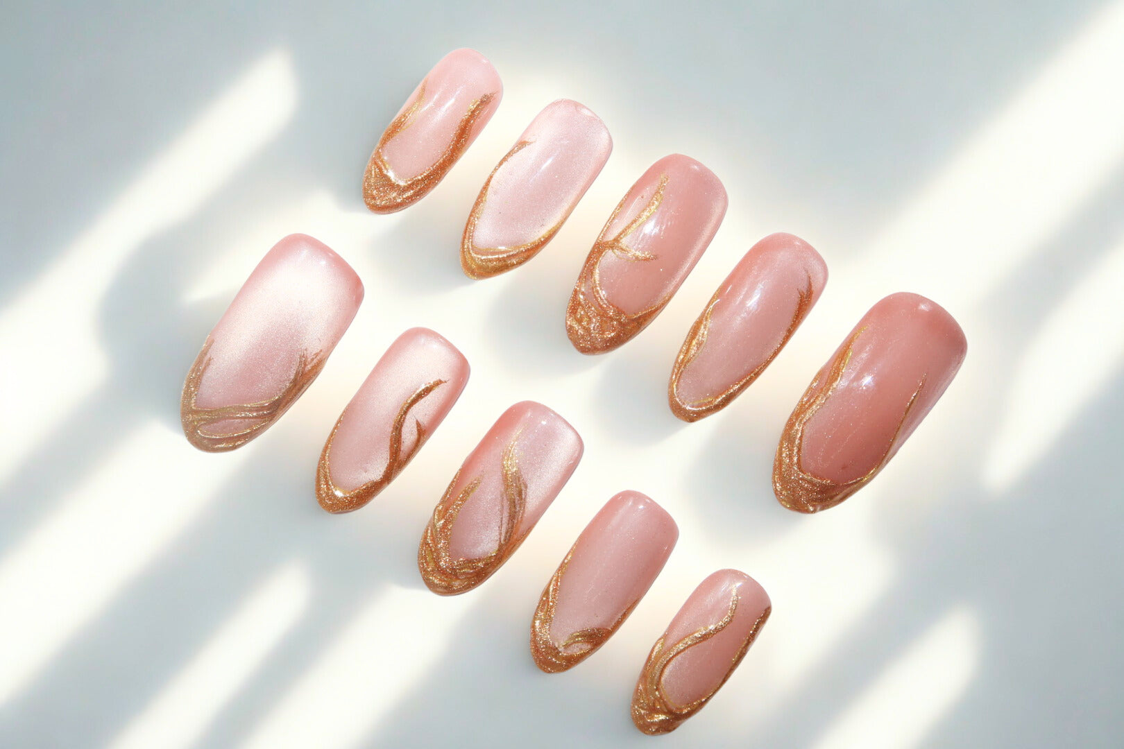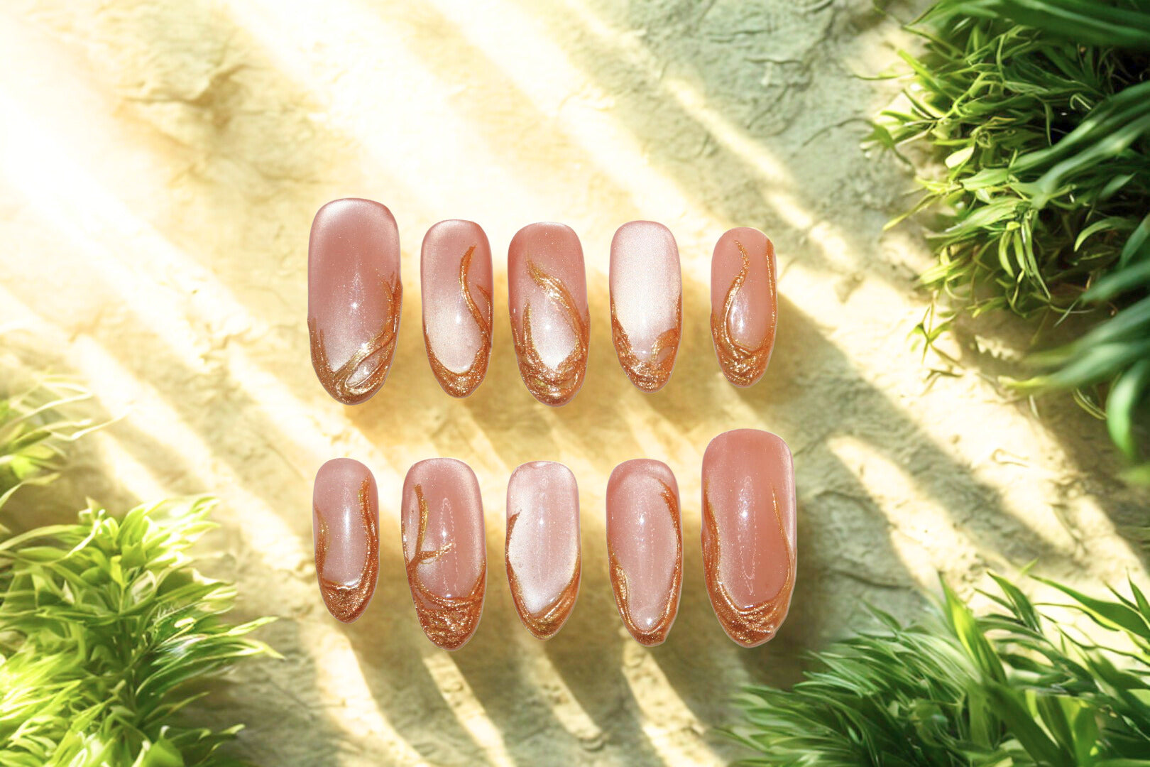 These captivating nails feature a rich cateye pink base, beautifully adorned with intricate leaf and floral designs. The artwork combines varying shades of pink with subtle gold accents, creating an elegant and natural look. Each nail showcases unique details, enhancing the overall botanical theme. The glossy finish adds depth and shine, making these nails perfect for a nature-inspired aesthetic, ideal for both everyday wear and special occasions.