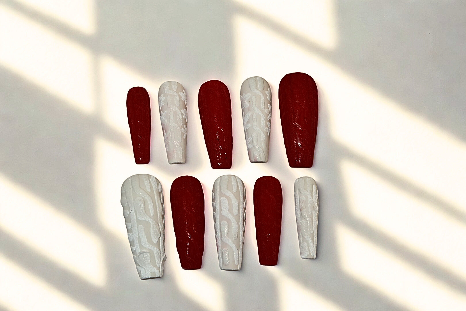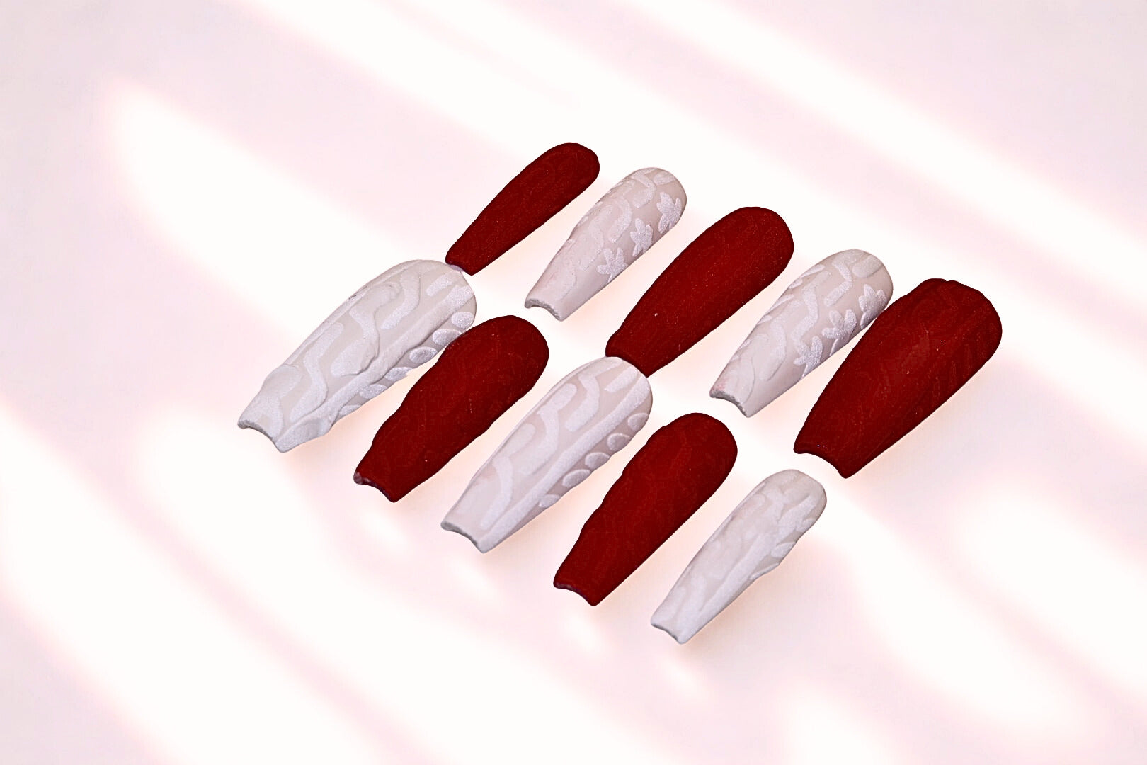 Striking red and white matte nails adorned with patterns you’d typically see on a winter sweater. Very cute and bold colours yet also very intricate and subtle patterns.