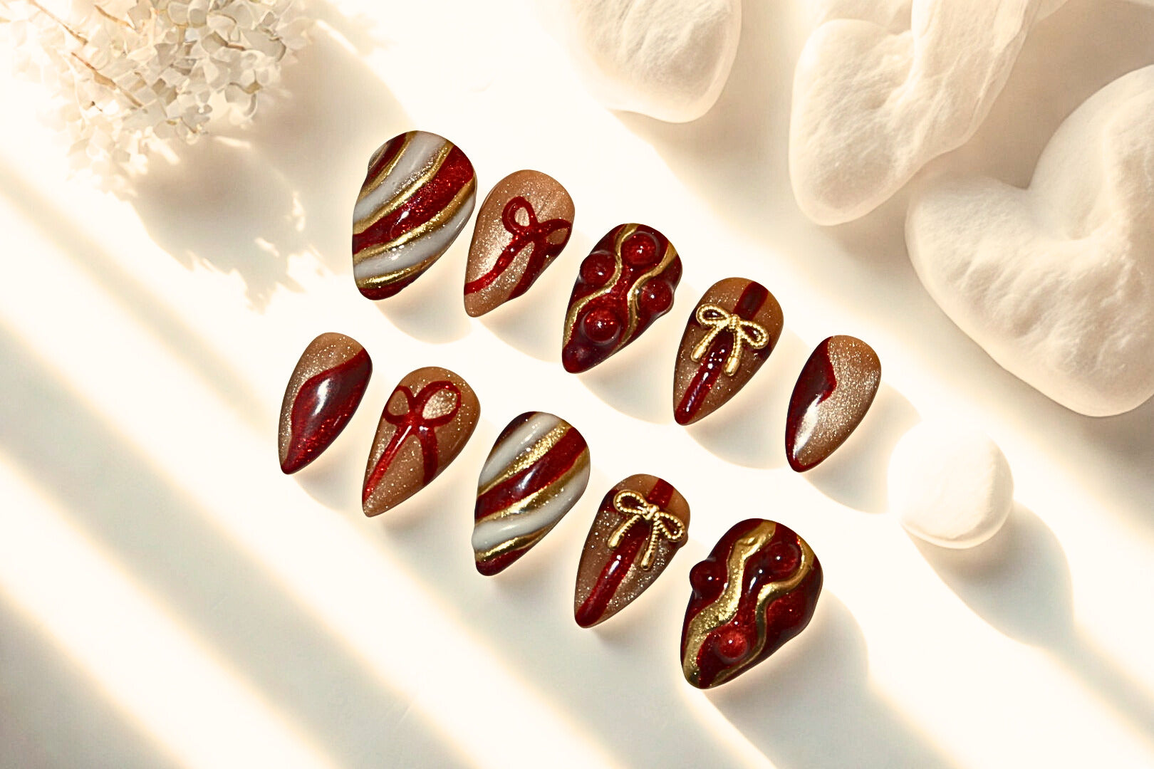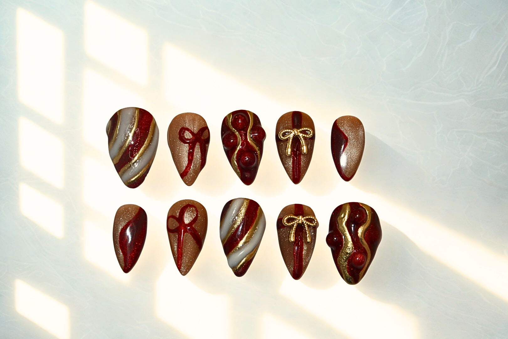 The image showcases a stunning set of ten artificial nails displayed in two parallel rows. Each nail features a unique design, beautifully blending a rich color palette of burgundy, gold, and shimmering beige tones. Patterns vary from elegant swirling lines to festive decorations like bows and dots, lending a luxurious and celebratory aura to the collection.