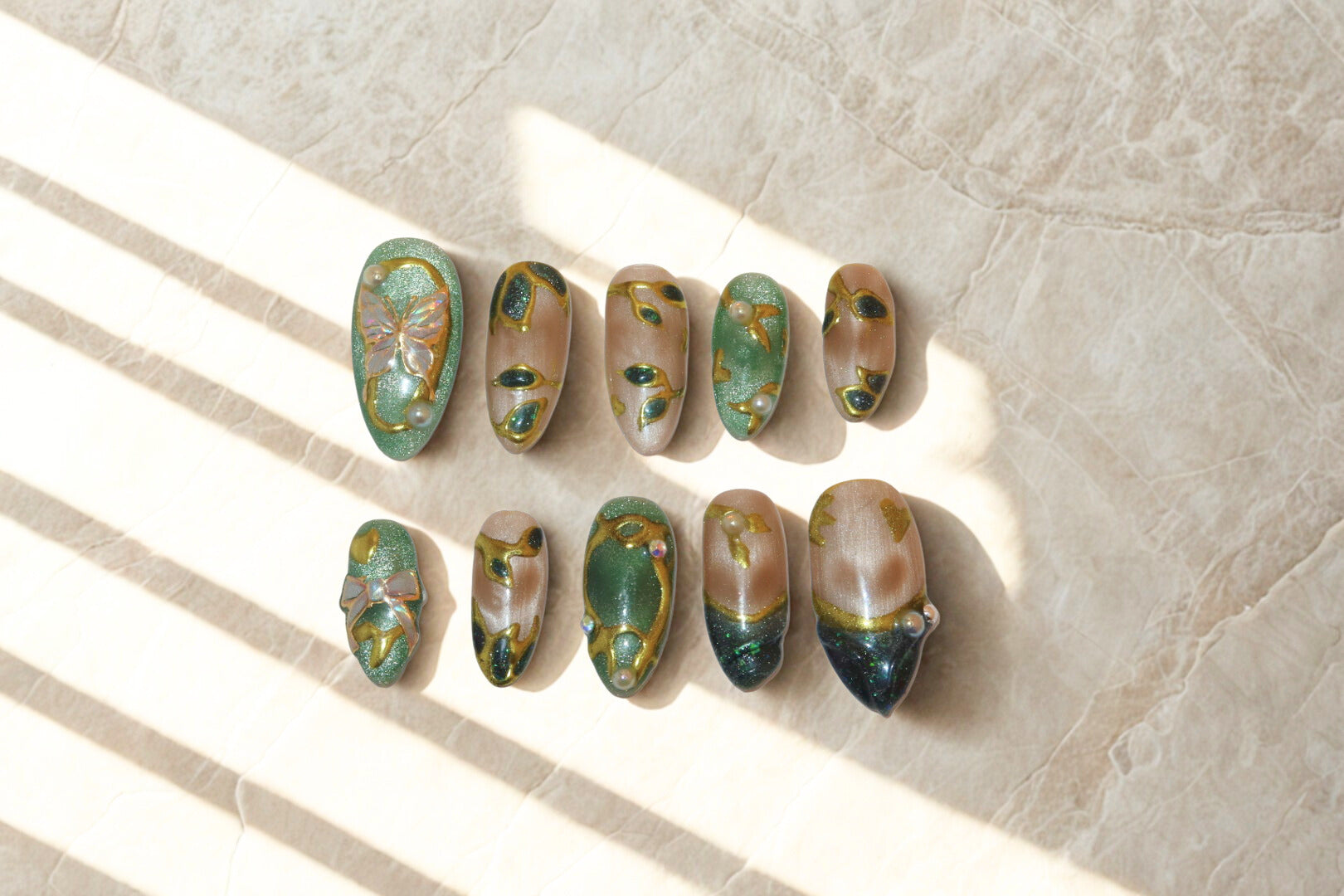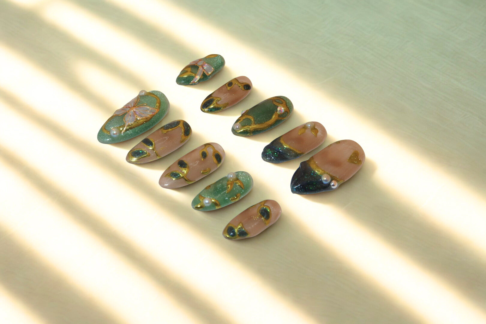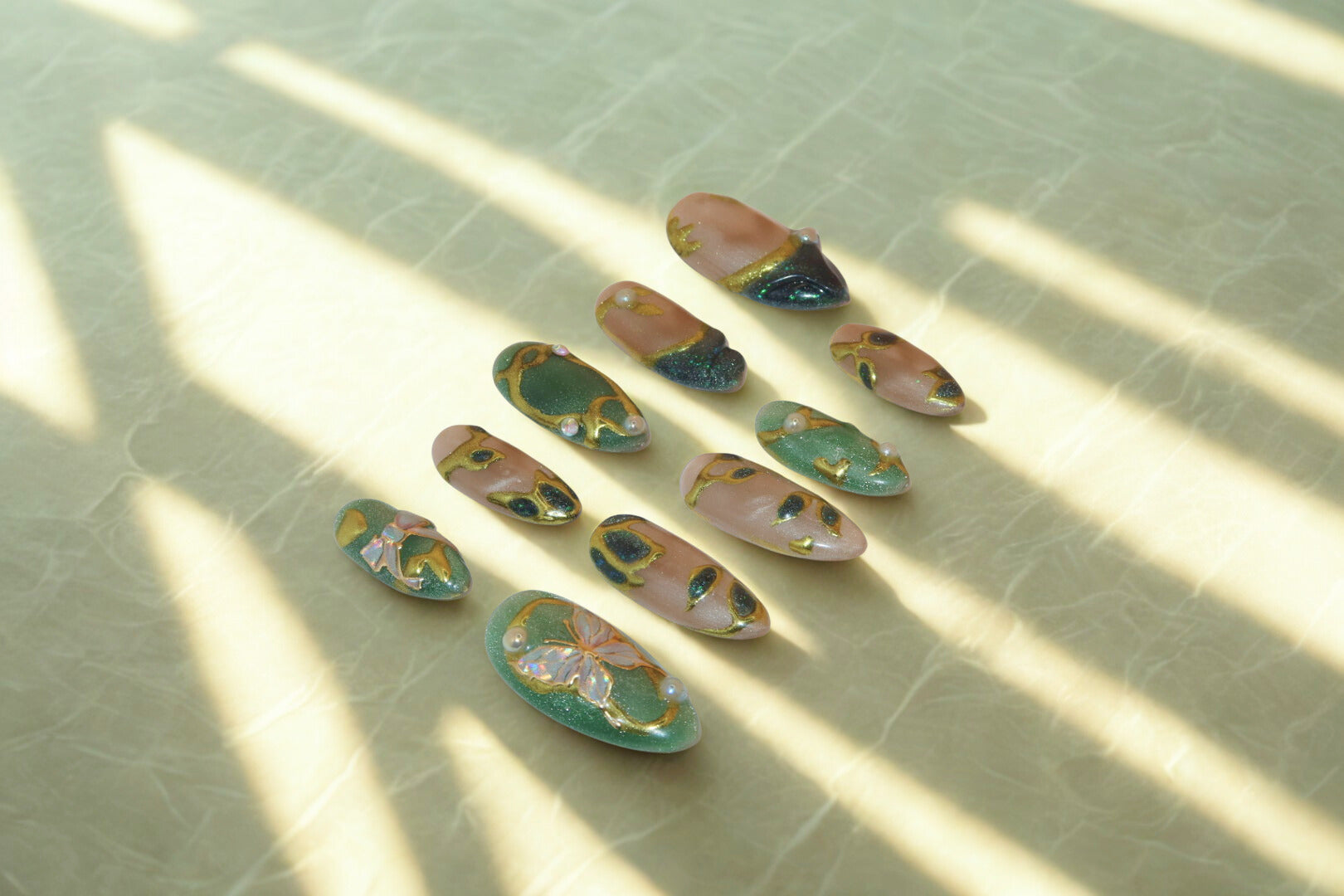 A beautiful blend of soft green and beige tones, adorned with sparkling gold accents, delicate floral designs and a marbled effect, evoking a sense of elegance.